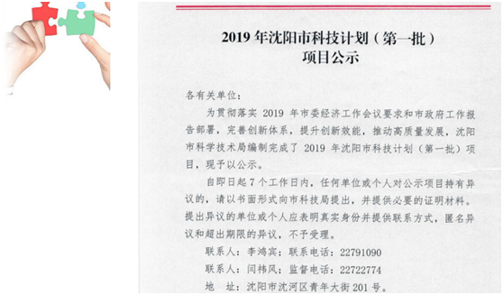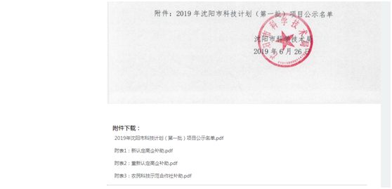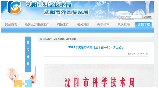 公司获得沈阳市科学技术局“2019年沈阳市科技计划(第一批)项目”奖励。
