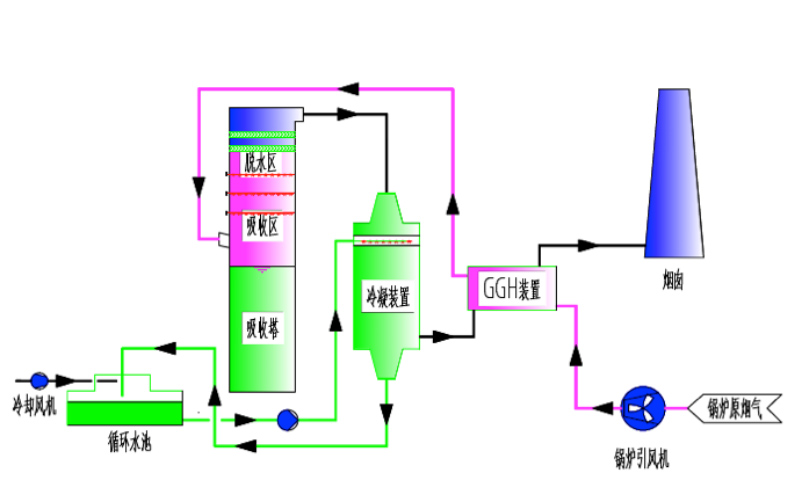 该技术在深度净化热湿废气的同时,利用“热泵原理”回收废气中的汽化潜热。解决湿烟气的“脱白”、“超低排放”、及热回收问题。
