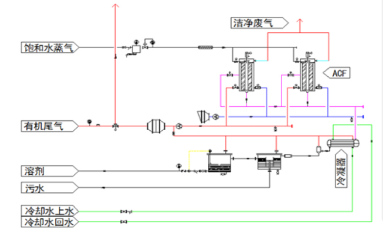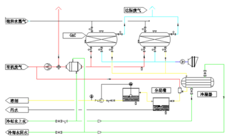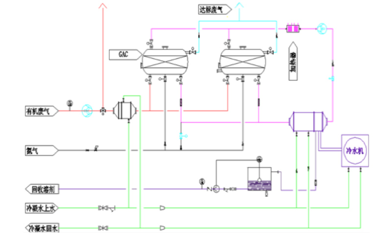 本设备工艺采用颗粒活性炭颗粒(GAC)作为吸附材料,高效吸附回收尾气中的有机溶剂。充分利用颗粒活性炭(GAC)孔径丰富,吸附效率高的特点,满足对不同大小分子溶剂的吸附,利用热氮气将活性炭加热至VOC沸点温度,再利用风机出脱出来。回收设备适合沸点在200℃以内和溶于水的VOCs,如苯乙烯、丙酮、乙酸乙酯等。