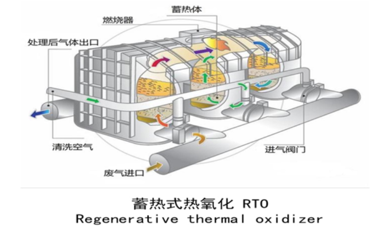 有机废气加热700℃到以上,废气中的VOCs氧化分解成二氧化碳和水。氧化产生的高温气体流经特制的陶瓷蓄热体,使陶瓷体升温而“蓄热”,此“蓄热”用于预热后续进入的有机废气。从而达到废气升温时减少燃料消耗的技术。
