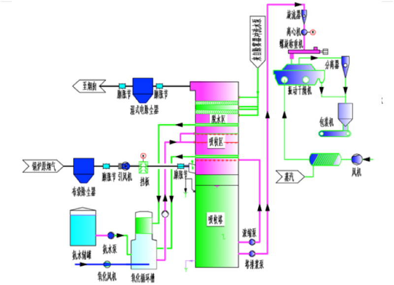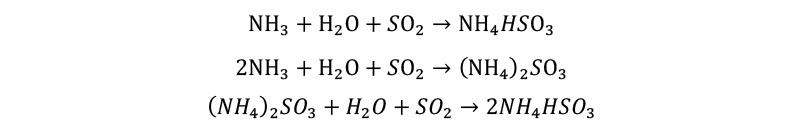 氨法脱硫技术是将氨水通入吸收塔中,使其与烟气中的接触反应,吸收产物可用来制造化肥。氨法脱硫工艺成熟、性能可靠,脱硫效率达到以上。反应方程如下: