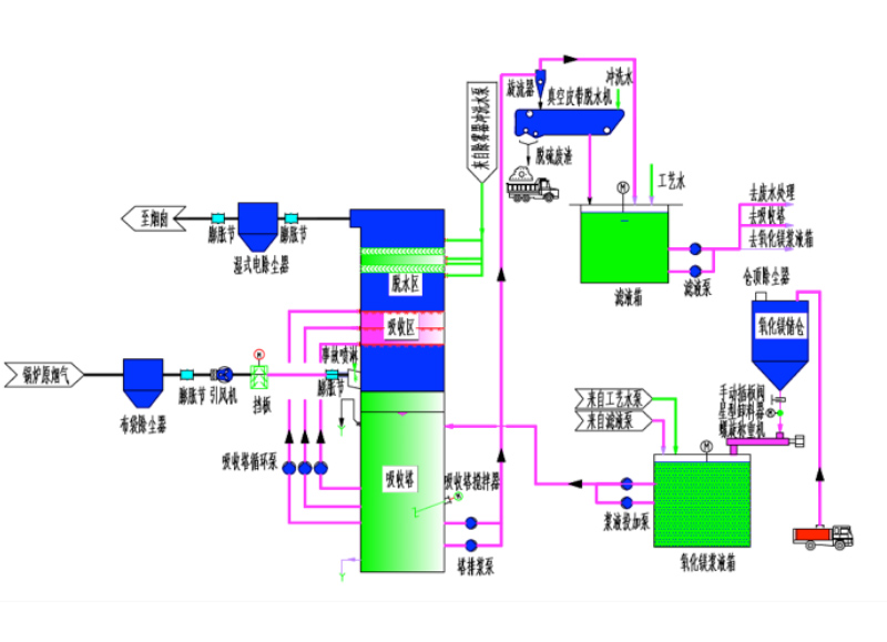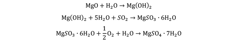 氧化镁脱硫技术是将氧化镁作为吸收剂吸收烟气中的,可生产含结晶水的亚硫酸镁和硫酸镁。可将反应物从吸收液中分离出来,并进行干燥,最后将干燥的压硫酸镁和硫酸镁进行煅烧分解,再生成氧化镁可作为脱硫剂。氧化镁法脱硫工艺成熟、性能可靠,脱硫效率达到以上。反应方程如下: